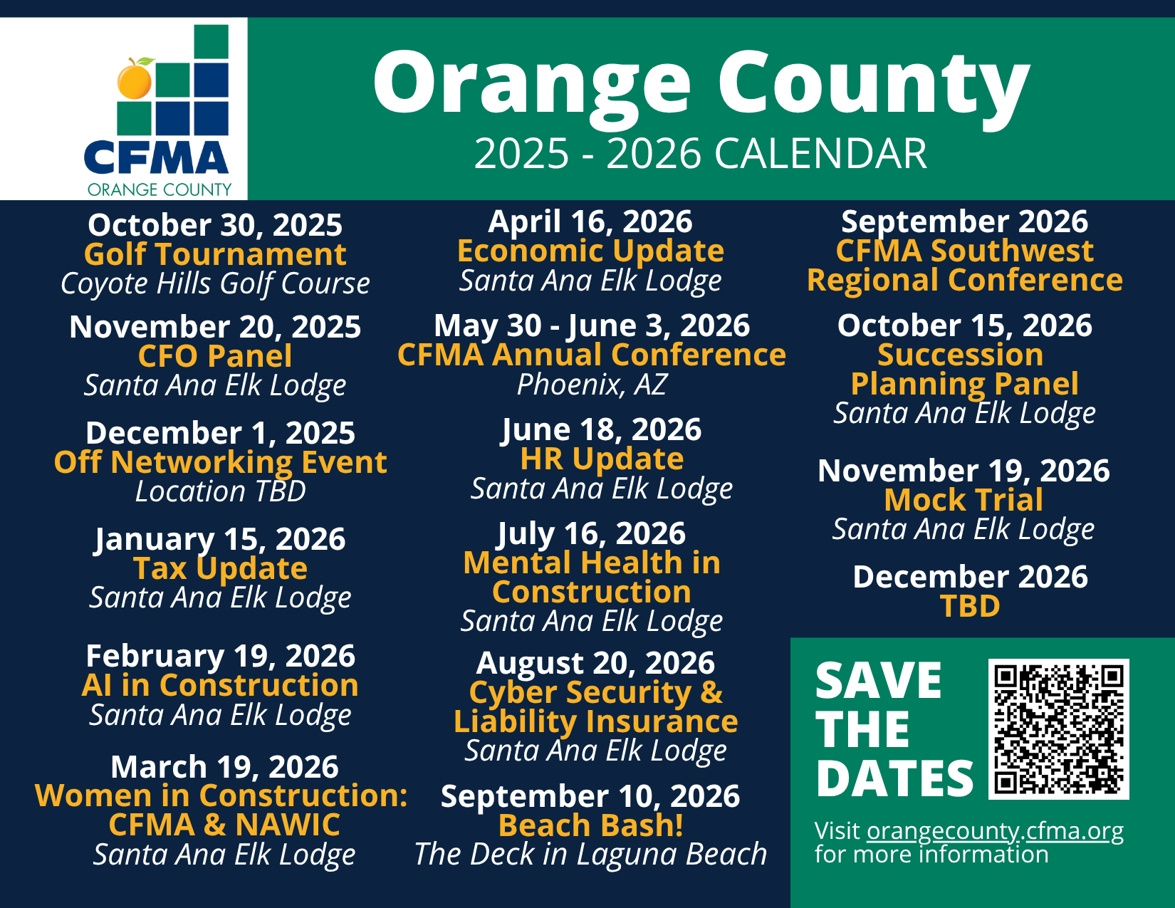 The Orange County Chapter of the Construction Financial Management Association (CFMA) is a network of professional financial managers dedicated to serving the construction industry.